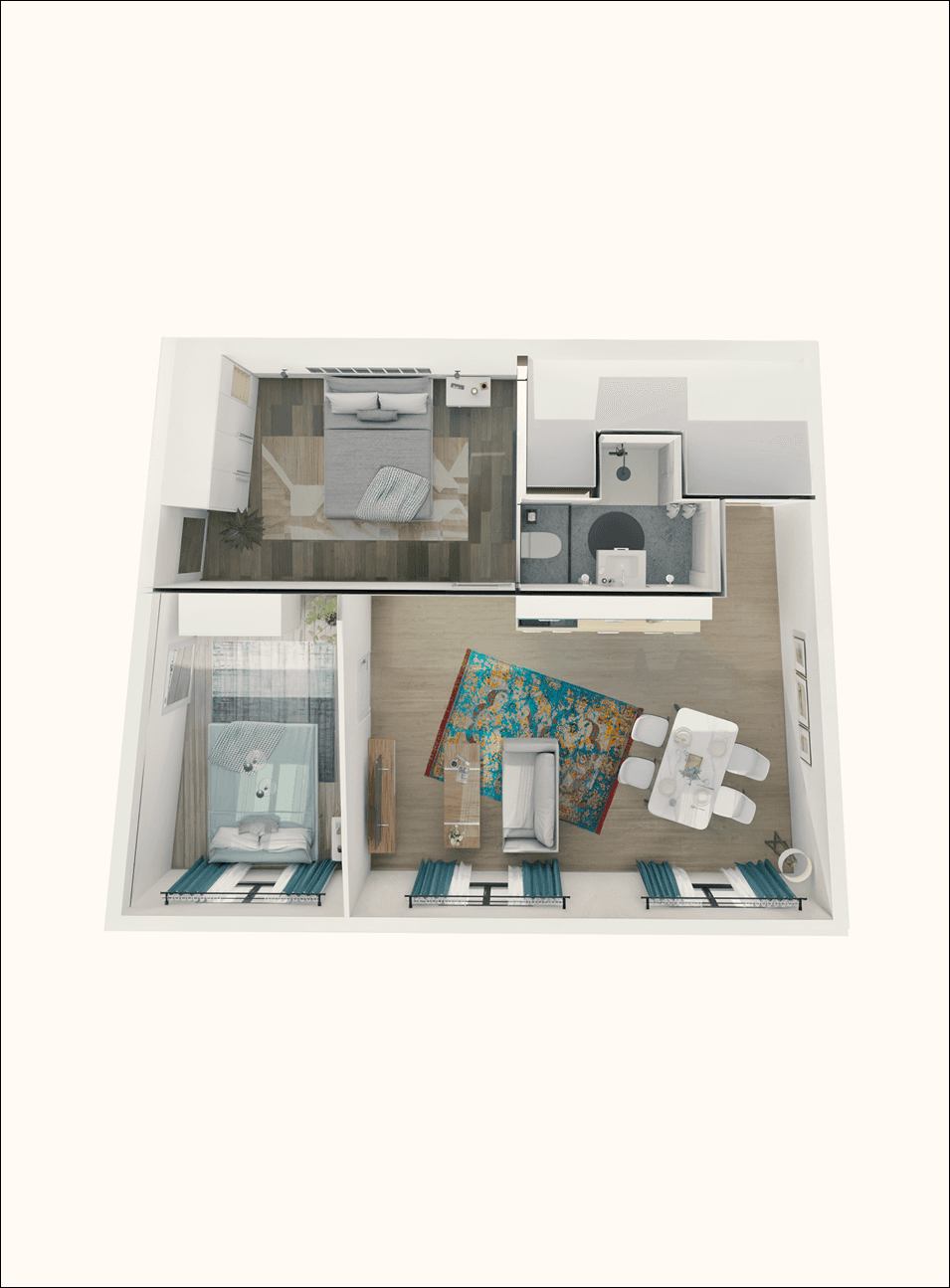 Architectural floor plan drawn to scale based on on-site measurements, with layout proposals developed under specific constraints: creating two bedrooms, using existing water inlets, and allocating dedicated areas for the living room and kitchen.After plan approval, a scaled 3D architectural model was created, including furniture, to help visualize the overall interior design.
